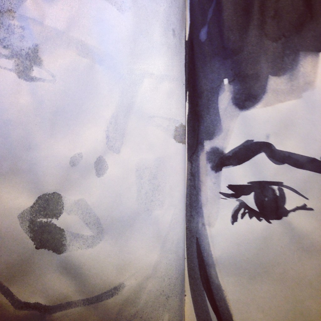 Studio di volti con tecnica all’acqua (inchiostri, ecoline e acquerello) su taccuino Morgantina. La carta non è adatta per questa tecnica, ma il risultato, con tratti veloci e pochi passaggi, rende il supporto interessante: si creano ondulazioni.