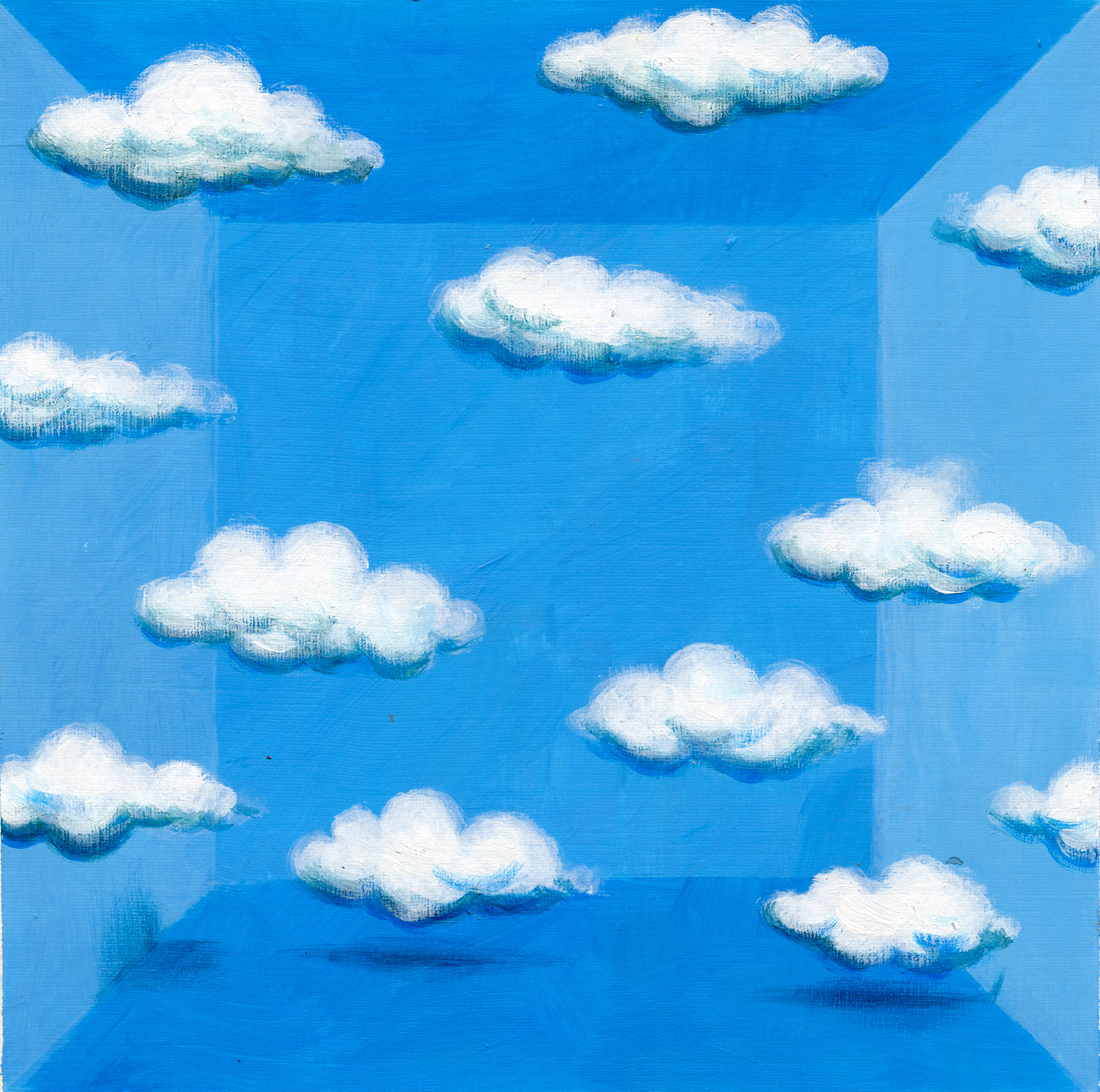 Giochiamo a illudere uno spettatore di vedere qualcosa… ma in realtà sta vedendo solo un foglio di carta e ben venuti nel regno incantato della finzione pittorica! Magritte usa delle realtà amplificate: ad esempio la rappresentazione dei cieli (nuvolosi, sereni, diurni, notturni…). La sua tecnica è quella della pittura a olio, essendo una tecnica che prevede colori costosi e, soprattutto, l’impiego di un solvente (la trementina) non è indicata da usare a scuola. Suggeriamo di usare le tempere (eventualmente i colori acrilici che, come le tempere, finché freschi si sciolgono con acqua, ma a differenza di quelle, una volta asciutti, non sono più idrosolubili: quindi, occhio a non sporcare i vestiti!). Le useremo a corpo, cioè in maniera coprente, per avvicinarci alla pittura piuttosto pastosa di René.