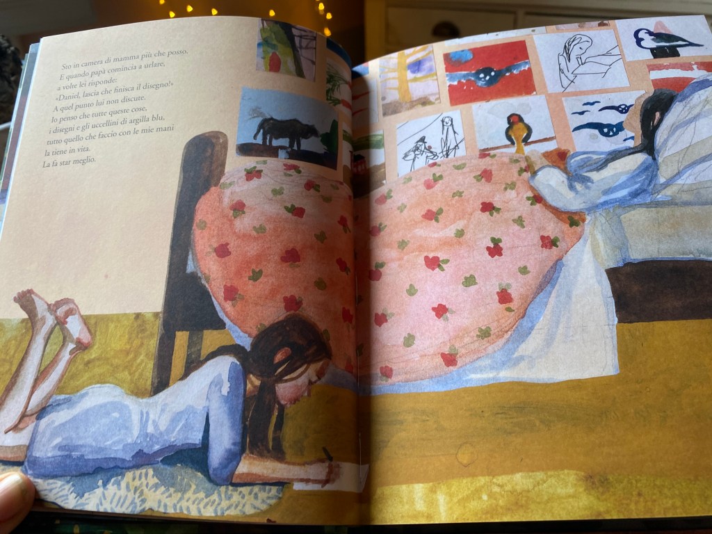 Curiosando, avevo incontrato questo libro, piccolo di dimensioni, stampato su una bella carta uso mano, copertina cartonata, molte pagine per essere un albo, tantissime illustrazioni di grande peso per essere una narrativa per ragazzi. Un libro epifania, questo era chiaro, una meravigliosa eccezione dai “format” tipici, almeno nell’editoria italiana che conosco.