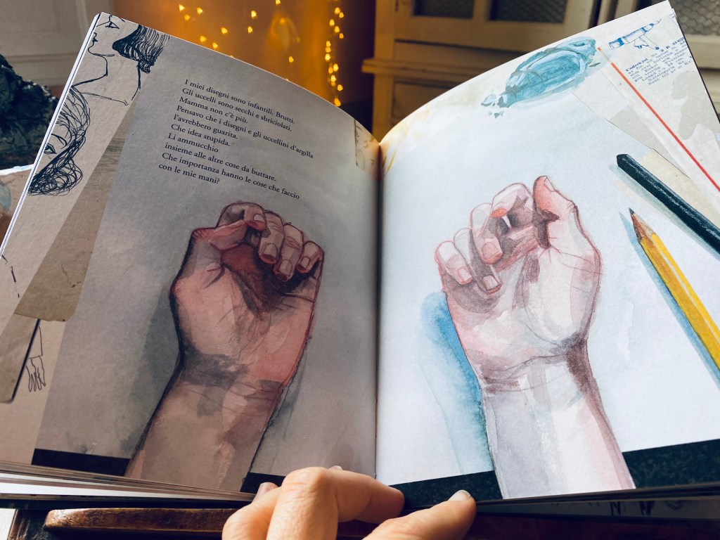 Di Sara Lundberg, per fortuna, troviamo molto, dal suo sito a questo libro. Le sue immagini sono per noi, riprodotte, perché pensate per il medium libro. La magia della tecnica all’acqua che percepiamo abbaglia nei chiari, ci invischia e ci incupisce quando si fa gouache spessa; ci congela negli acquerelli azzurri che si raffreddano ancora di più per trasparenza sul foglio bianco, ci avvolge in pennellate spesse, dense e curve come a risarcire abbracci mancati. E di tanto in tanto, piccoli camei di collage, talora di stampe, talora di carte preparate: piccole diserzioni dalla tecnica pittorica “più nobile” che aumentano l’espressività dell’insieme. Lo stile a volte realistico, a volte abbozzato, rapido, quasi non curante della realtà e delle anatomie che emerge in alcune tavole, più un pizzico di andamenti pittorici sinuosi (in cui mi sembra di vedere la vicinanza della pittura dei grandi maestri del nord Europa), ci dice di in una narrazione che sembra essere stata urgente. Le immagini delle mani, di un’artista di cui si racconta come queste mani quasi funzionassero in automatico senza un’educazione alla pittura e alla scultura, fatte dalle mani di una artista contemporanea che sta lavorando con le proprie, sono l’apoteosi di questo gioiello.