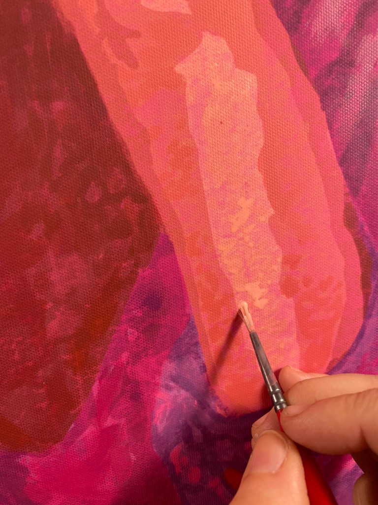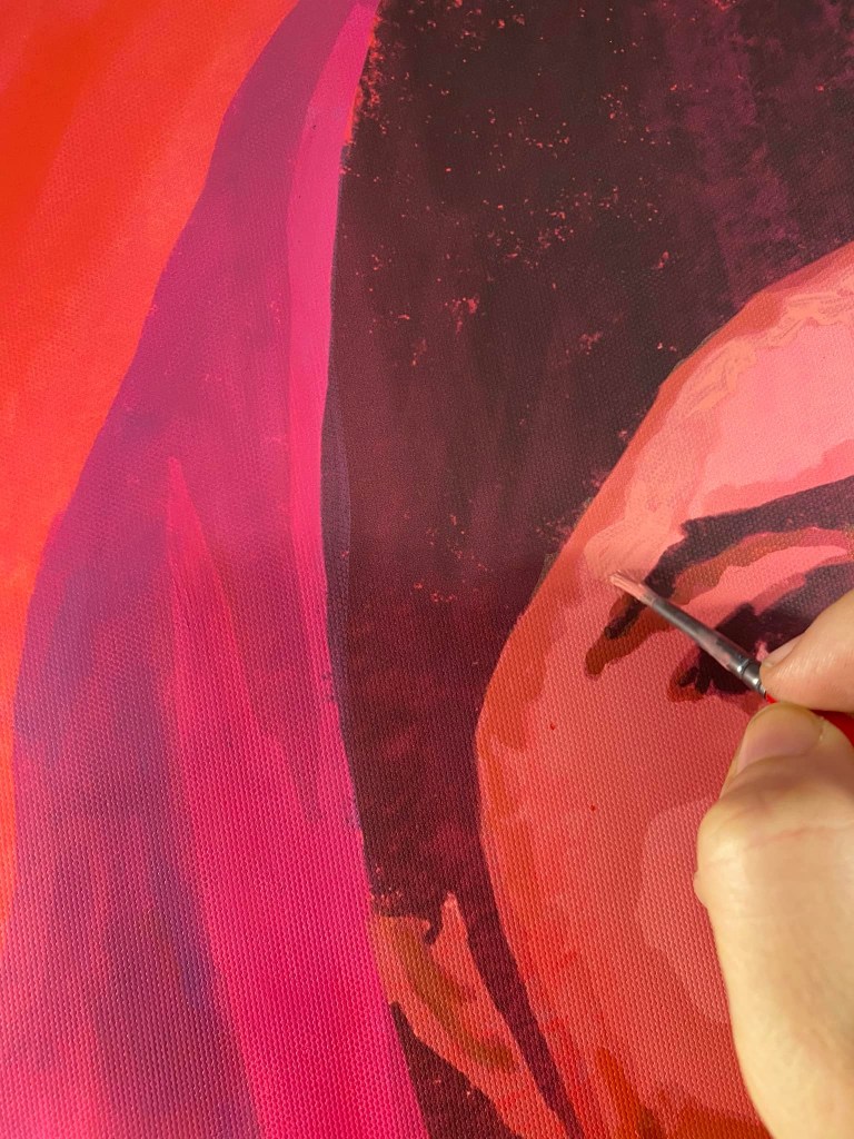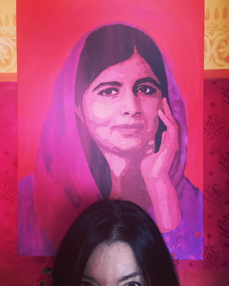 Ora noto che la mia Malala in rosso cadmio e magenta si trova piuttosto a suo agio appoggiata a questa parete.