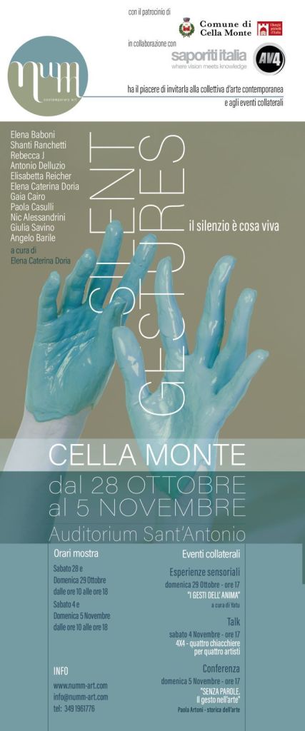 ‘Silent Gestures – il silenzio è cosa viva‘ è il titolo dell’esposizione che presenta nell’Auditorium Sant’Antonio di Cella Monte le opere di 11 artisti contemporanei che interpretano il tema con tecniche diverse, ma con l’unico intento di creare un percorso emozionale per i visitatori.