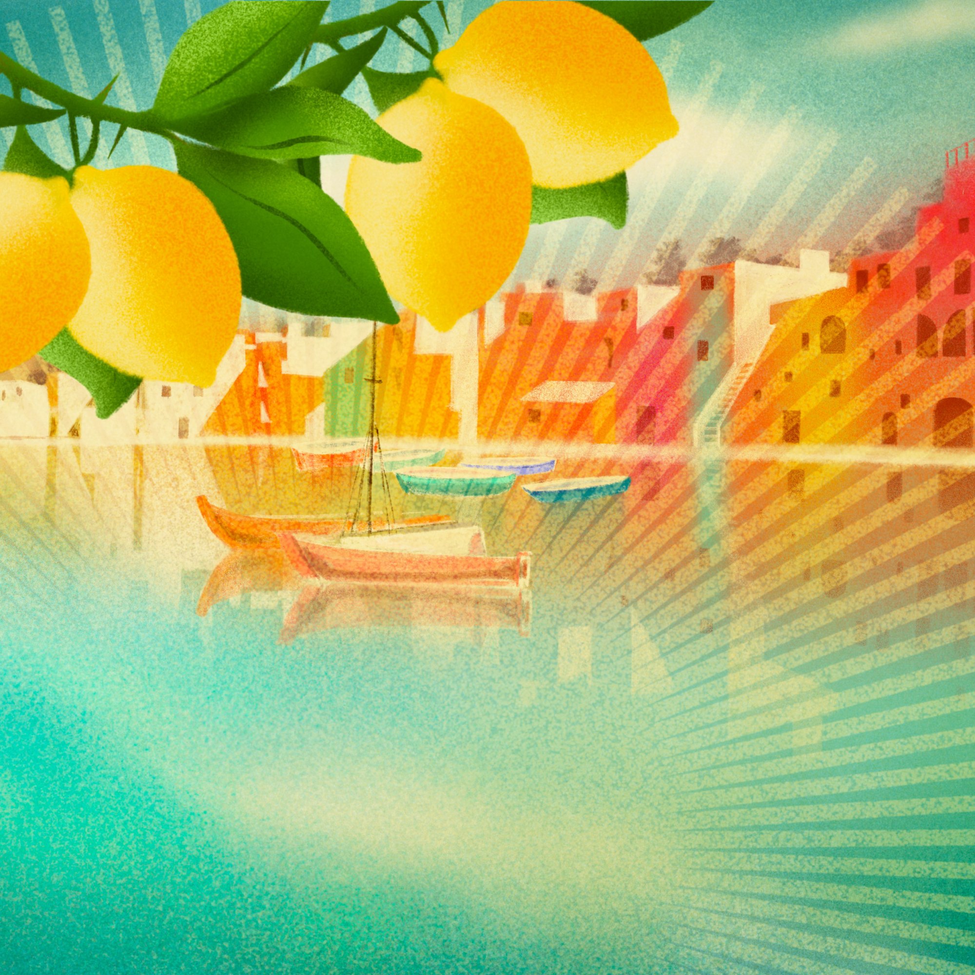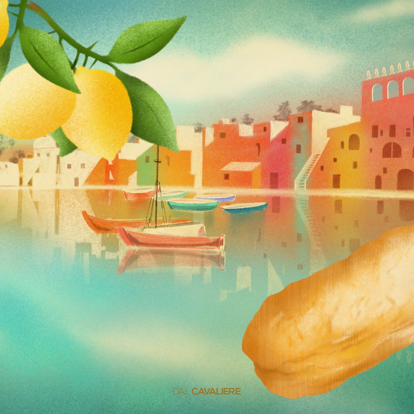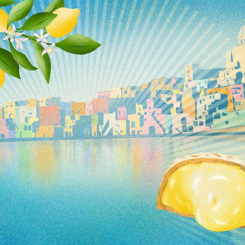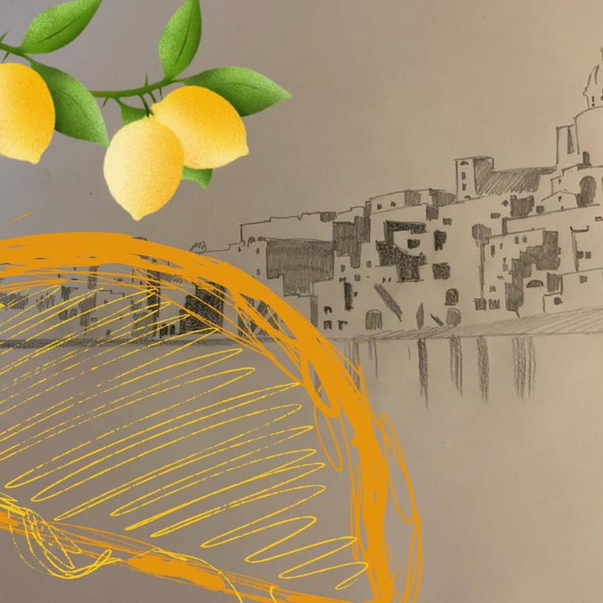 Due illustrazioni, con dettagli di limoni e di dolci tipici dell’isola, Frollicella e Lingua, per il packaging rinnovato della pasticceria Dal Duca di Procida.